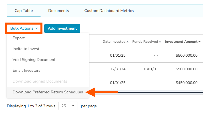 The preferred return schedules can be downloaded in bulk for a given class from the Bulk Actions drop-down from within the Cap Table. The file will be received as a zip file and emailed upon completion. There are two requirements for this option to be enabled from the Bulk Actions drop-down.