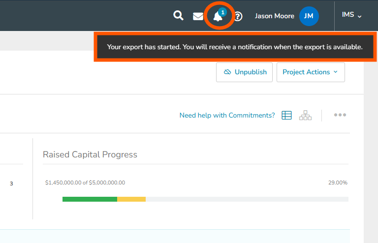 3. A message will appear in the top-right corner of the screen: "Your export has started. You will receive a notification when the export is available."