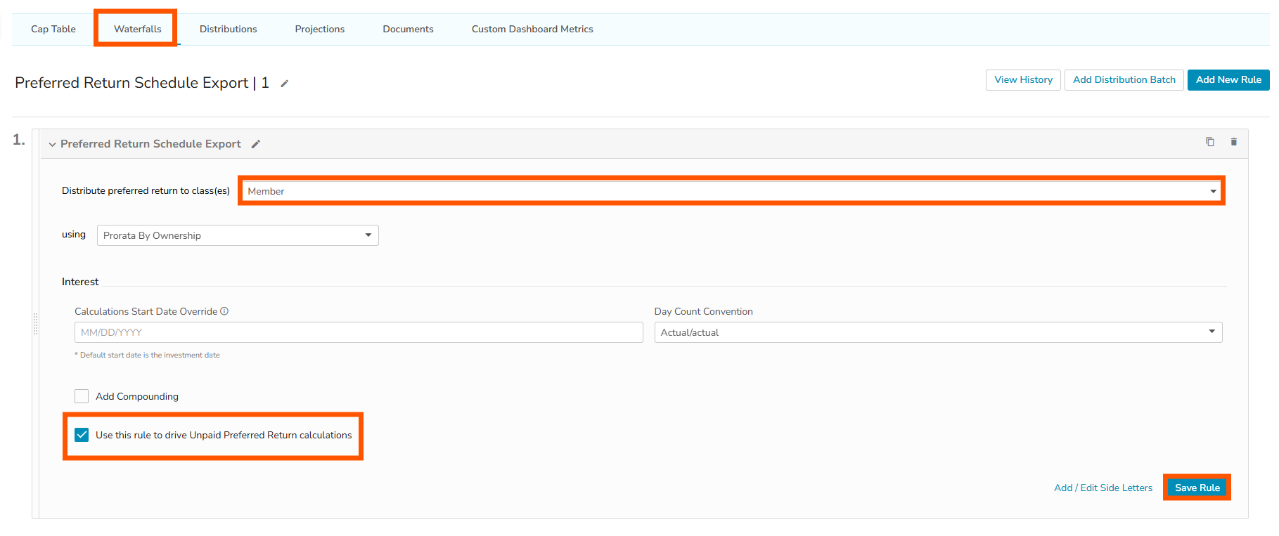 2. The Preferred Return Template must be added to at least one waterfall, with the same class saved into the rule. The checkbox to "Use this rule to drive Unpaid Preferred Return calculations" must also be checked. If you are unfamiliar with Waterfalls, please review our Getting Started and Adding Rules articles first.